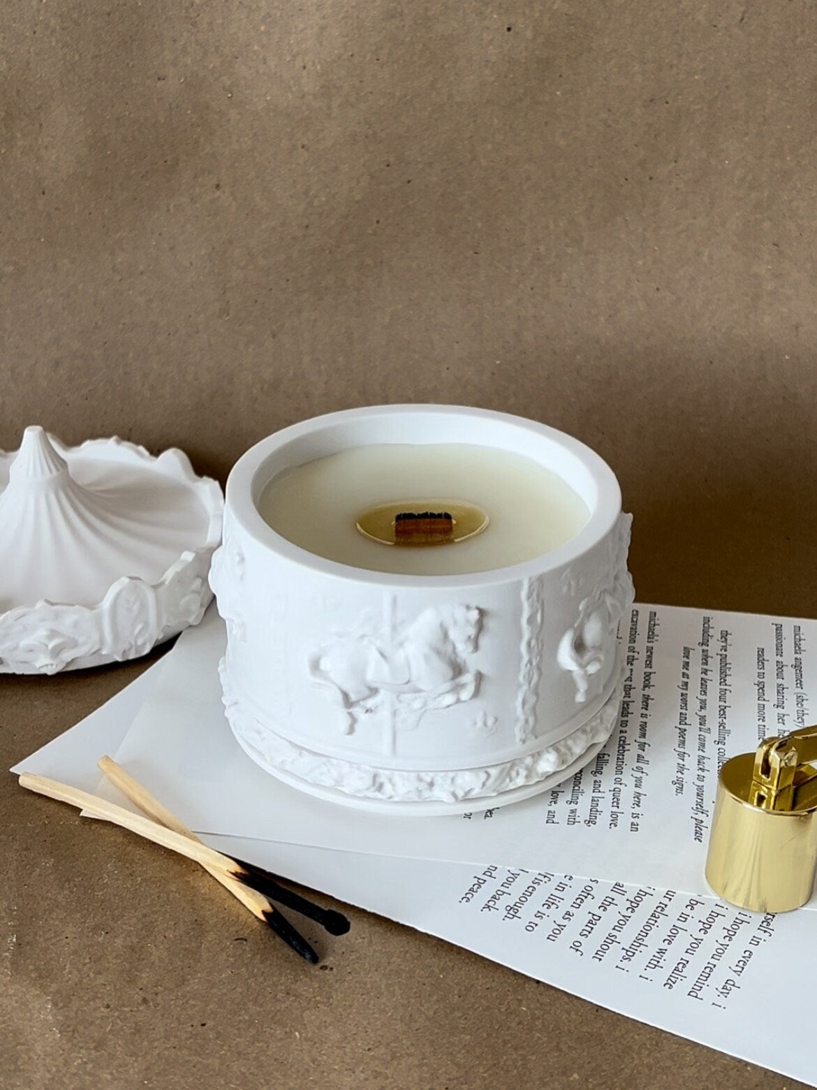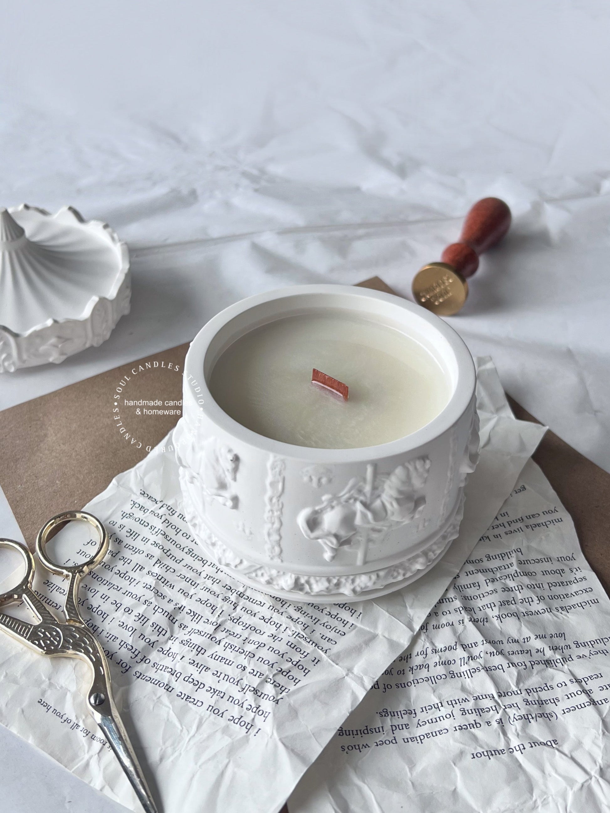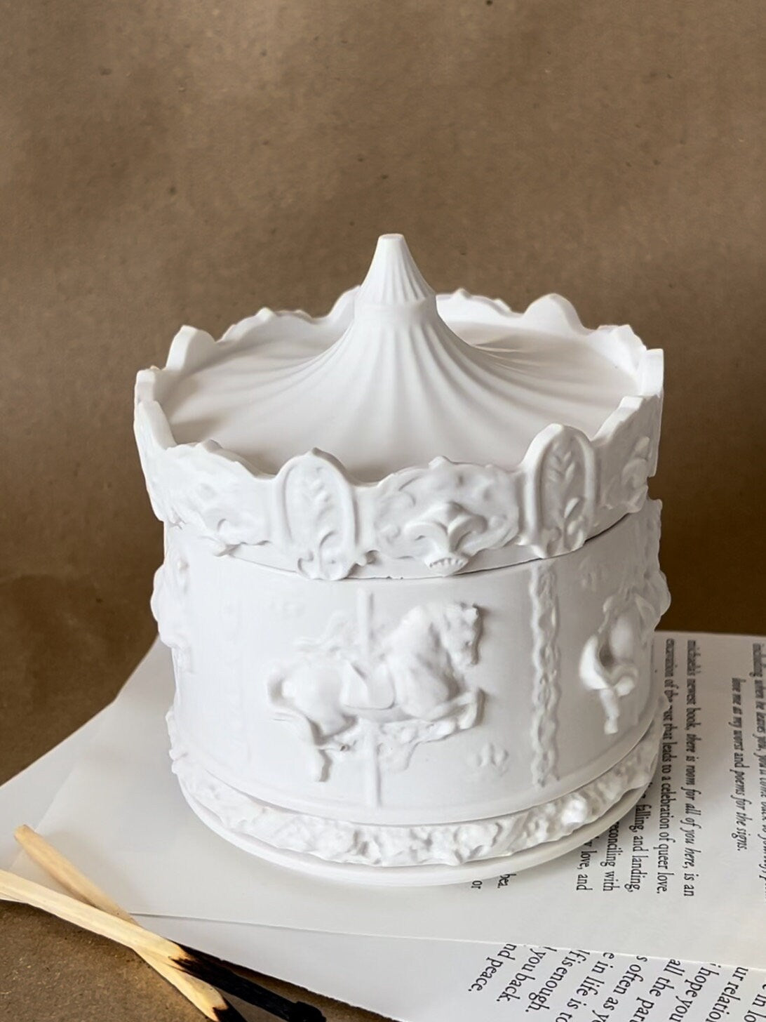 Unsere Karusell Kerze lädt zum träumen ein. Ihr detailliert- verspieltes Design macht sie zu einem ganz besonderem Hingucker. Durch den Holzdocht verbreitet sich ihr feiner Duft harmonisch im ganzen Raum. Das leise knistern des Holzdochtes erinnert beim Abbrennen an ein kleines Lagerfeuer. Das Gehäuse, welches mit viel Sorgfalt handgegossen wird, kann nach dem vollständigen Abbrennen der Kerze anderweitig zum Beispiel als Schmuckschatulle genutzt werden. Sojawachs ist zu 100% biologisch abbaubar.